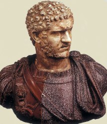 Lucio Septimio Bassiano, Caracalla, nació en Lugdunum (Lyon) el 4 de Abril de 188 y murió, asesinado por orden del Prefecto del Pretorio Marco Opelio Macrino, el 8 de Abril de 217 en Edesa (Mesopotamia). Hijo mayor de Julia Domna y del Emperador Septimio Severo; con 7 años le fue otorgado el título de César (Príncipe Heredero) por su padre, con la idea de mantener un linaje que rigiera los destinos del Imperio como si fuera un sistema hereditario. Poco, o muy poco, se sabe de la adolescencia de Caracalla; por lo que deja entrever el historiador contemporáneo Dion Casio, era un joven extrovertido y afable, pero todo cambió en 208, cuando su padre Severo asoció al trono a su hermano Geta; a esto hay que sumarle que Geta era el preferido de la hermosa Julia Domna. Quizá los celos y el hecho de estar “enamorado” de su madre, un idilio probable, hicieron de Caracalla un ser detestable y cruel; el odio que Caracalla sentía hacia su hermano Geta, era visceral.