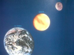 . Marte, el «Planeta Rojo», cuarto de nuestro Sistema, el último de los rocosos o terrestres. Conocido desde tiempos remotos y siempre relacionado con la sangre y el fuego debido a su color rojizo, los babilonios lo llamaron Nirgal, Señor de la Guerra, los griegos Ares y los romanos Marte. Sus dos satélites, Fobos y Deimos (los combativos hijos del dios guerrero); ambos fueron descubiertos en 1877 por A. Hall. Fobos, es el mayor y más cercano, con un diámetro medio de 22 km., girando alrededor del planeta a una distancia de 6000 km., esta cercanía hace que su traslación sea el doble de rápida que la rotación de Marte; un hipotético marciano vería pasar su luna mayor dos veces el mismo día. Como su órbita se va reduciendo, dentro de millones de años, Fobos, será absorbido por el planeta, o quizá, desintegrado dejando un anillo de polvo. Deimos, el más pequeño (12 km. de diámetro) y alejado (24000 km.), con toda seguridad un pedrusco capturado del cinturón de asteroides que hay entre Marte y Júpiter.